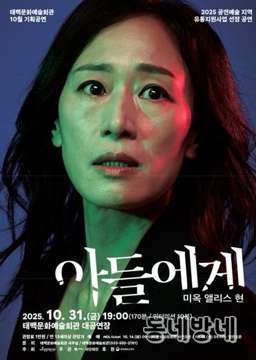 동네방네 김형규 기자 | 태백시는 태백문화예술회관 10월 기획공연으로 연극 '아들에게(부제: 미옥 앨리스 현)'을 오는 10월 31일 오후 7시, 태백문화예술회관 대공연장에서 선보인다고 밝혔다.