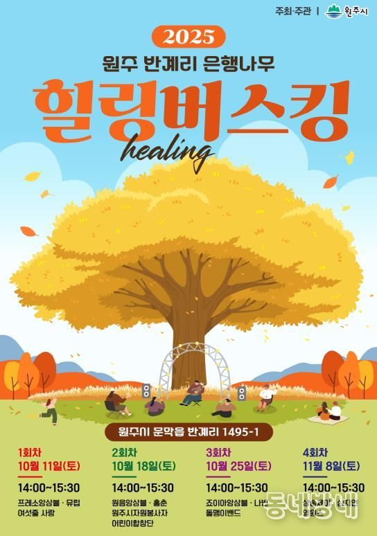 2025 힐링 버스킹은 앞으로 3회(10월 18일·25일, 11월 8일) 공연을 남겨두고 있으며, 문막읍 반계리 은행나무 광장에서 오후 2시부터 3시 30분까지 진행된다.