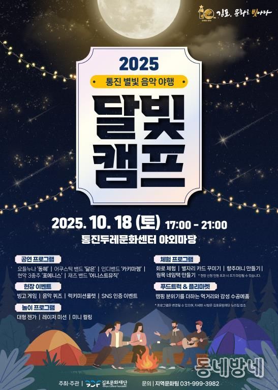 동네방네 김형규 기자 | (재)김포문화재단이 주관하는 2025 통진별빛음악야행 '달빛캠프'가 10월 18일 17시부터 통진두레문화센터 야외마당에서 개최된다.