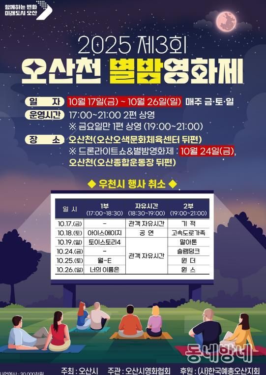 동네방네 김형규 기자 | 오산시는 오는 10월 17일부터 26일까지 매주 금·토·일 저녁, 오산천(오색문화체육센터 뒤편)에서 시민들이 야외에서 영화를 즐길 수 있는 '2025 제3회 오산천 별밤영화제'를 개최한다고 밝혔다.