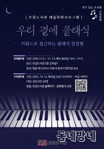 동네방네 김형규 기자 | 김포시 모담도서관은 클래식을 주제로 11월 6일부터 13일까지 매주 목요일 오후 7시부터 9시까지 특별 강연을 운영한다.