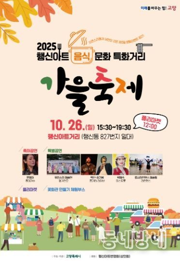 동네방네 김형규 기자 | 고양특례시는 오는 26일 오후 3시 30분부터 오후 7시 30분까지 ‘행신아트 음식문화 특화거리 가을축제’를 행신아트거리 일대에서 개최한다고 밝혔다.