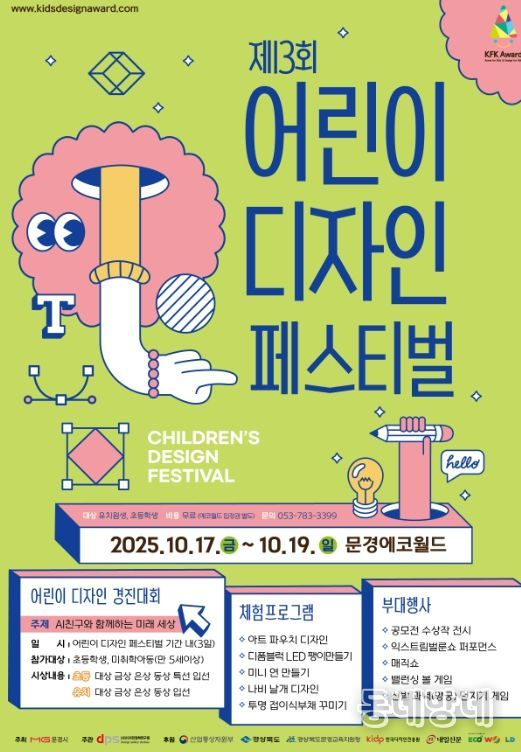 동네방네 김형규 기자 | 경상북도와 문경시가 주최하고 (사)디자인정책연구원이 주관하는 제13회 대한민국 어린이제품 디자인 공모전 ‘어린이 디자인 페스티벌’이 10월 17일부터 19일까지 사흘간 문경에코월드에서 열린다.