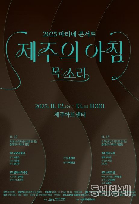 동네방네 김형규 기자 | 제주아트센터는 11월 12일과 13일 이틀간 오전 11시 마티네 콘서트 ‘제주의 아침’을 개최한다.