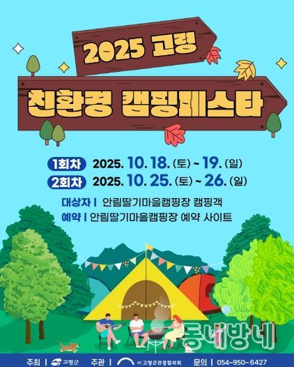 동네방네 김형규 기자 | 지역과 미래를 배려하는 친환경 캠핑 문화 확산을 위해 마련된 ‘2025 고령 캠핑 페스타’가 오는 10월 18일부터 19일, 10월 25일부터 26일 두 차례에 걸쳐 안림딸기마을캠핑장에서 열린다.