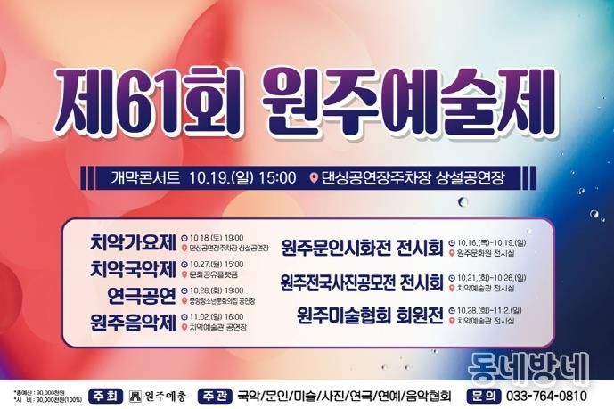동네방네 김형규 기자 | (사)원주예총은 오는 10월 16일부터 11월 2일까지 원주시 댄싱공연장 주차장 상설공연장과 치악예술관 전시실 등 원주 전역에서 시민과 함께하는 ‘제61회 원주예술제’를 개최한다.