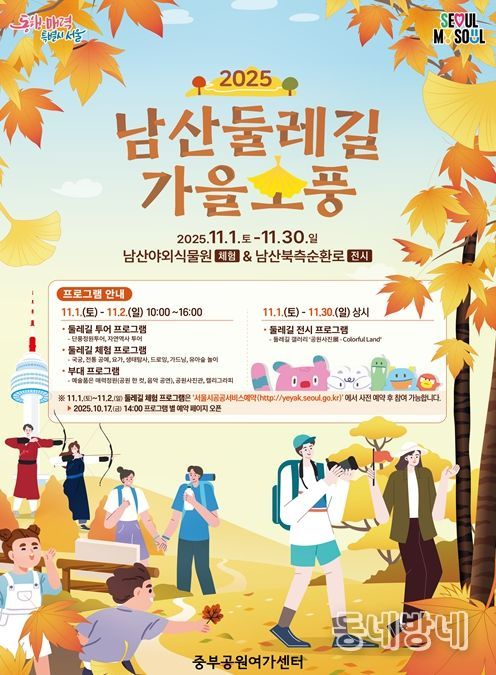 서울시 중부공원여가센터는 11월 1일부터 한 달간 남산둘레길 일대에서 단풍으로 물든 곳곳을 걷고 보고 즐길 수 있는 계절 특별프로그램 '2025년 남산둘레길 가을소풍'을 운영한다.