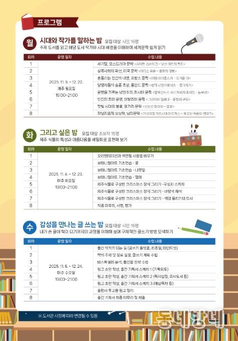 김봉석 탐라도서관장은 “이번 야간 프로그램이 바쁜 일상 속에서도 시민들이 다양한 문화활동을 즐길 수 있는 기회가 되길 바란다”고 밝혔다.