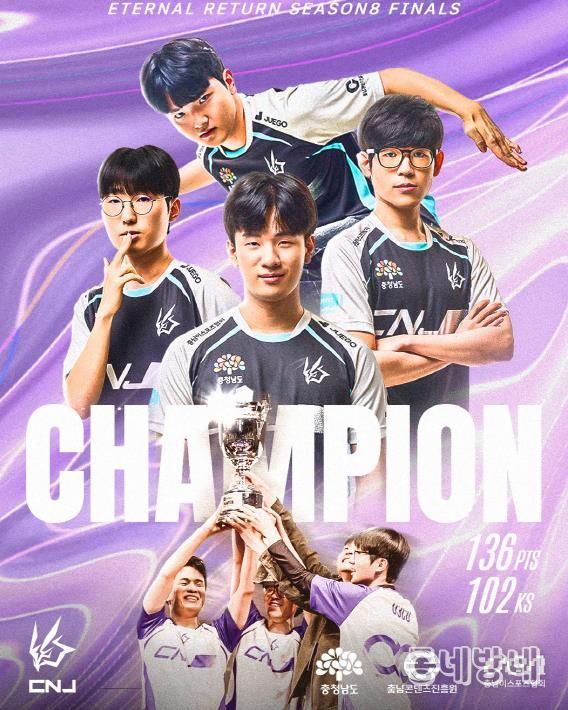 동네방네 김형규 기자 | (재)충남콘텐츠진흥원은 충청남도를 대표하는 이스포츠 게임단 ‘CNJ Esports가 2025년 10월 12일 대전 드림 아레나에서 열린 이터널 리턴 마스터즈 시즌8 파이널에서 우승을 차지했다고 밝혔다.