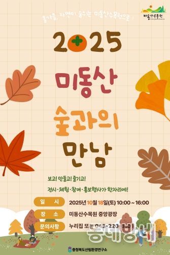 동네방네 김형규 기자 | 충청북도 산림환경연구소는 오는 10월 18일(토), 미동산수목원에서 ‘2025년 미동산 숲과의 만남’행사를 개최한다고 밝혔다.