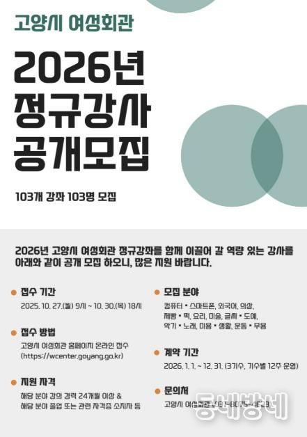 동네방네 김형규 기자 | 고양특례시 여성회관에서 2026년 정규강좌 운영을 위한 정규강사진을 공개 모집한다.