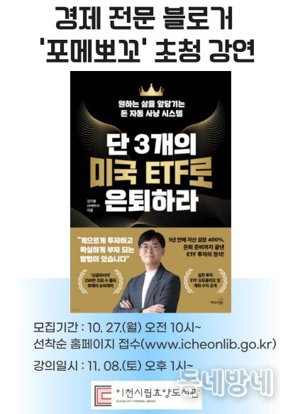 동네방네 김형규 기자 | 이천시 효양도서관은 시민들의 경제적 이해력 향상과 현명한 자산 관리 능력 제고를 위해 오는 11월 8일 오후 1시, '단 3개의 미국 ETF로 은퇴하라'의 저자이자 네이버 경제 전문 블로거 김지훈(필명 포메뽀꼬)을 초청해 재테크 특강을 진행한다.