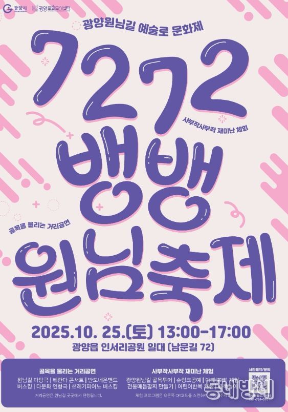 동네방네 김형규 기자 | 광양문화도시센터는 오는 10월 25일 금요일 오후 광양읍 인서리공원 일대에서 광양원님길 브랜드 축제 ‘7272뱅뱅원님축제’를 개최한다고 밝혔다.