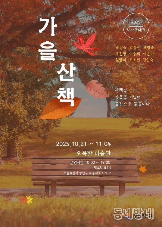 동네방네 김형규 기자 | 양천구는 10월 21일부터 11월 4일까지 오목공원 내 ‘오목한미술관’에서 가을 정취를 담은 기획전시 '가을 산책'을 개최한다고 밝혔다.