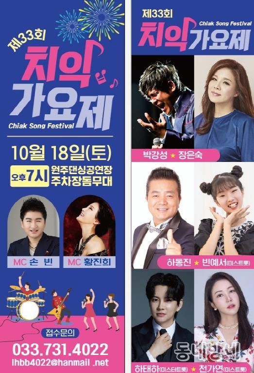 동네방네 김형규 기자 | (사)한국연예예술인협회 원주지부가 주관하는 ‘제33회 치악가요제’가 오는 18일 오후 7시, 댄싱공연장 주차장 상설공연장에서 화려하게 막을 올린다.