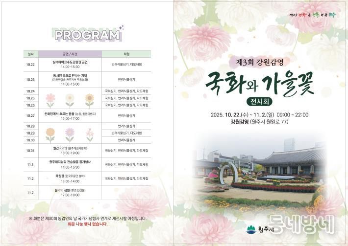 이에 더해 11월 1일 오후 2시에는 가을꽃으로 물든 강원감영을 배경으로 강원특별자치도 무형유산 원주매지농악 전승활동 공개행사가 펼쳐져 관람객들에게 색다른 볼거리를 선사할 예정이다.