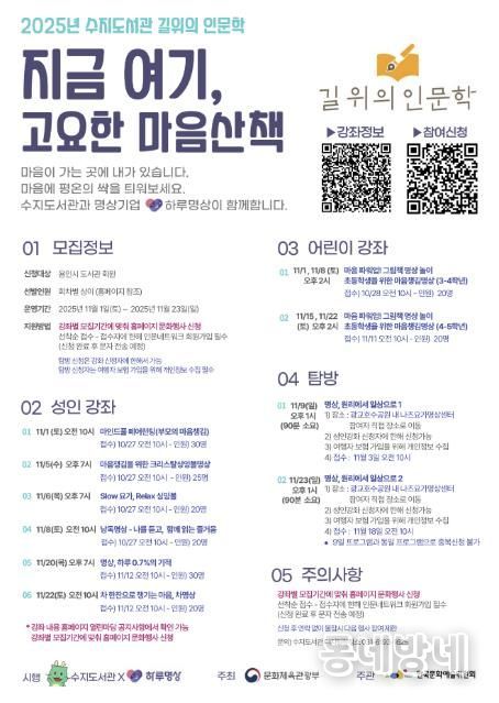 동네방네 김형규 기자 | 용인특례시 수지도서관은 오는 11월 1일부터 23일까지 ‘2025년 길 위의 인문학’ 프로그램 ‘지금 여기, 고요한 마음 산책’을 운영한다고 17일 밝혔다.