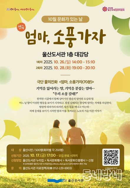 동네방네 김형규 기자 | 울산도서관은 10월 문화가 있는 달을 맞아 오는 10월 마지막 주에 성악 공연 작은 음악회와 ‘엄마, 소풍가자’ 연극을 개최한다고 밝혔다.