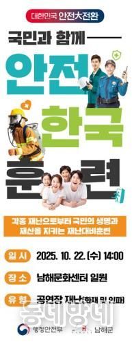 동네방네 김형규 기자 | 남해군은 각 기관의 협업체계와 현장 대응능력을 점검하기 위해 오는 10월 22일 남해문화센터 일원에서 ‘2025년 재난대응 안전한국훈련’을 실시한다고 밝혔다.