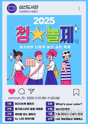 동네방네 김형규 기자 | 부평구 구립 삼산도서관은 11월 한 달간 청소년(중학교 1학년~고등학교 3학년) 대상 문화체험 프로그램 ‘청★놀제: 청소년이 나답게 놀고 싶은 축제’를 운영한다.