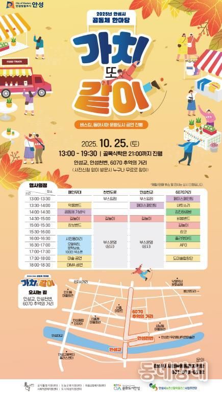 동네방네 김형규 기자 | 안성시는 오는 2025년 10월 25일, 안성시내 일원(안성교~안성천변~안성천~6070 추억의거리)에서 2025 안성시 공동체 한마당 ‘가치 또 같이’ 를 개최한다.