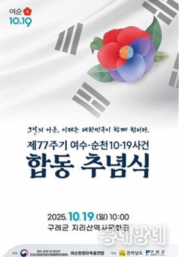 동네방네 김형규 기자 | 전남 구례군은 여순사건의 역사적 의미를 되새기고 희생자와 유족들을 위로하기 위한‘여순사건 제77주기 정부주최 합동추념식’이 오는 19일 구례군 지리산역사문화관에서 개최된다고 밝혔다.