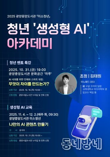 동네방네 김형규 기자 | 광양중앙도서관이 청년들의 디지털 활용 역량을 강화하고 창의적 자기계발을 지원하기 위한 프로그램 ‘청년 생성형 AI 아카데미’의 수강생을 모집한다.