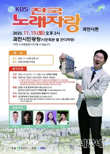동네방네 김형규 기자 | 과천시는 대한민국 대표 장수 프로그램 KBS1TV ‘전국노래자랑’이 오는 11월 15일, 과천시민광장에서 공개녹화를 진행한다고 밝혔다. 이번 행사는 7년 만에 과천에서 열려, 시민들에게 특별한 추억을 선사할 것으로 기대된다.