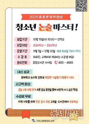 동네방네 김형규 기자 | 구미시립중앙도서관은 청소년들의 기초 문해력과 논리적 사고력 향상을 위해 마련한 논술특별프로그램 ‘청소년 논술마스터’ 수강생을 시립중앙도서관 누리집에서 선착순으로 모집하고 있다.
