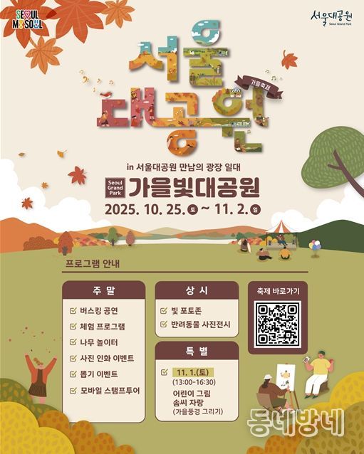 동네방네 김형규 기자 | 서울대공원 2025년 가을단풍축제 ‘가을빛대공원’이 10월 25일부터 11월 2일까지 서울대공원 일대에서 개최된다. 공원 전체를 가을빛으로 물들인 형형색색의 단풍을 즐길 수 있는 절호의 기회이다.