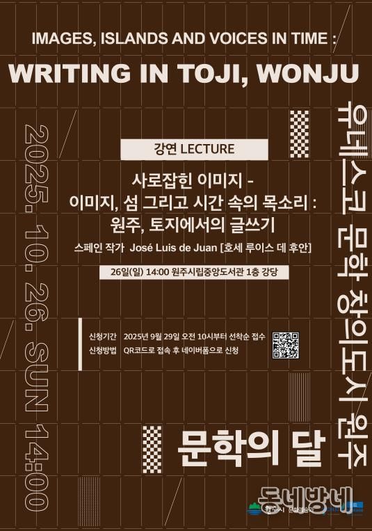 이번 강연은 ‘Images, islands and voices in time: writing in Toji, Wonju(이미지, 섬 그리고 시간 속의 목소리: 원주, 토지에서의 글쓰기)’를 주제로, 작가가 원주에서 집필하며 느낀 한국의 문학적 풍경과 예술적 영감을 공유하는 자리다. 문학을 통해 세계와 지역이 소통하는 유네스코 창의도시의 정체성을 보여주는 ‘2025 원주 문학의 달’의 뜻깊은 기념행사로 마련됐다.
