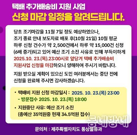 동네방네 김형규 기자 | 제주특별자치도는 택배 추가배송비 지원 사업이 당초 11월 7일 종료 예정이었으나, 신청 급증으로 10월 23일 오후 11시(방문 접수 오후 6시)에 조기 종료된다고 밝혔다.