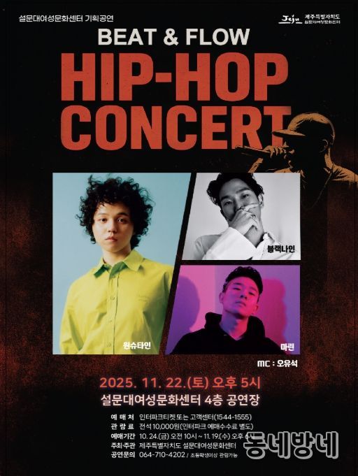 동네방네 김형규 기자 | 제주특별자치도 설문대여성문화센터는 ‘설문대 문화의 날’ 11월 기획공연으로 ‘원슈타인·블랙나인·마린 힙합콘서트’를 11월 22일 오후 5시에 공연장에서 선보인다고 밝혔다.