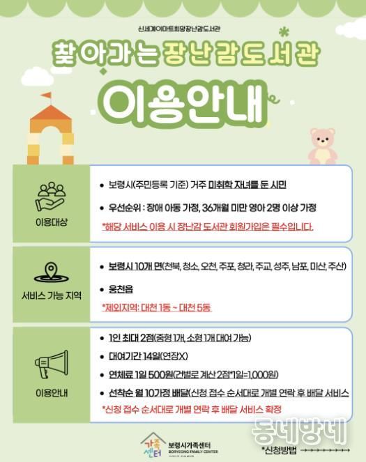 동네방네 김형규 기자 | 보령시는 읍·면 지역 거주 미취학 자녀 가정의 육아 부담을 덜어주기 위해 12월 31일까지 ‘찾아가는 장난감도서관’ 배달서비스를 시범 운영한다고 밝혔다.