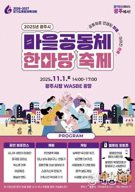 동네방네 김형규 기자 | 광주시는 깊어가는 가을 정취 속에서 ‘2025년 광주시 마을공동체 한마당’을 오는 11월 1일 오후 2시, 광주시청 WASBE 광장에서 개최한다고 24일 밝혔다.