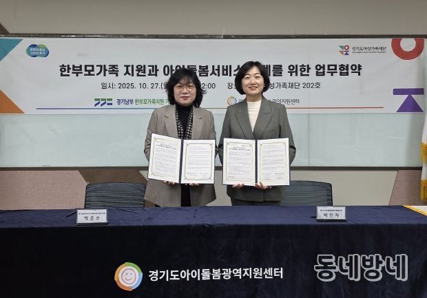 동네방네 김형규 기자 | 경기도여성가족재단 내 경기도아이돌봄광역지원센터는 27일 경기남부한부모가족지원거점기관과 한부모가족 지원 및 아이돌봄서비스 연계 강화를 위한 업무협약을 체결했다.