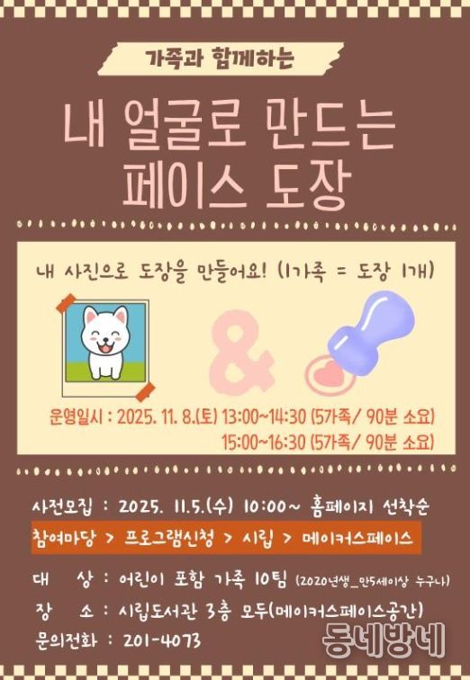 동네방네 김형규 기자 | 청주시립도서관은 오는 8일 도서관 3층 ‘모두(modoo)’에서 가족이 함께 참여할 수 있는 디지털창작 프로그램 ‘내 얼굴로 만드는 페이스도장’을 운영한다.