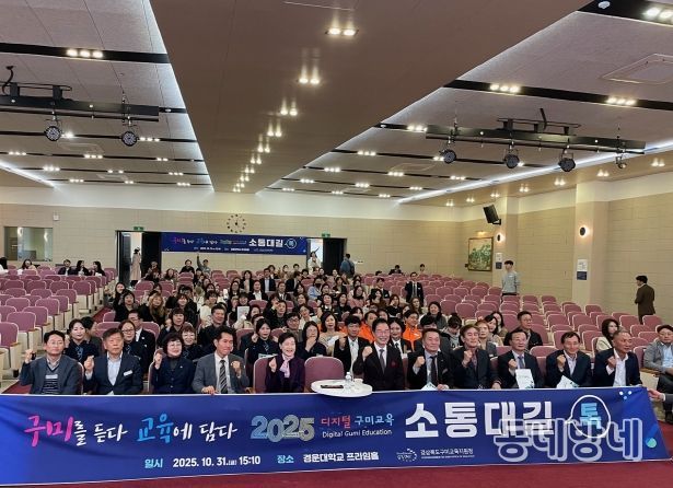 동네방네 김형규 기자 | 경상북도구미교육지원청은 10월 31일 금요일 경운대학교 프라임홀에서 도의회 의원, 경상북도교육청연수원장, 경상북도교육청구미도서관장, 관내 유·초·중·고등학교 교(원)장 대표, 학교운영위원장협의회, 학부모회협의회, 녹색어머니회, 구미학생안전자원봉사자회, 학부모자원봉사자회, 학생선도단, 학원연합회, 주민감사관, 교육계 원로, 교육발전특구 관계자 등 구미 교육가족 300여 명을 초청하여 ‘2025 교육감과 함께하는 구미교육 소통대길 톡’을 개최했다.
