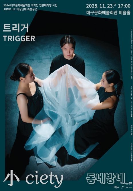 동네방네 김형규 기자 | 대구문화예술회관은 2024년 국악인 인큐베이팅 사업 'JUMP UP' 대상단체 특별공연으로, 한국 현악 트리오 트리거(TRIGGER)의 창작 공연 '小ciety'를 오는 11월 23일 비슬홀에서 선보인다.