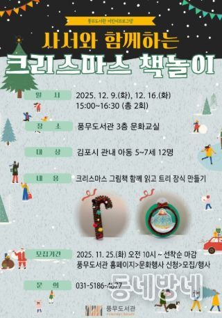 동네방네 김형규 기자 | 김포시 풍무도서관은 ‘사서와 함께하는 크리스마스 책놀이’프로그램을 12월 9일과 16일 오후 3시부터 4시 30분까지 운영한다.