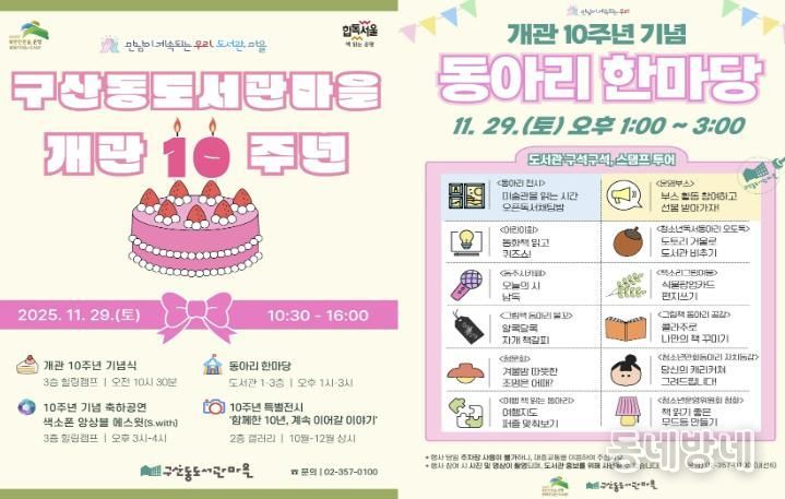 이순임 구산동도서관마을 관장은 “구민들의 서명운동으로 시작해 주민참여와 민·관 협치를 통해 탄생한 도서관이 어느덧 주민과 함께 성장한 10년이 됐다”며, “주민과 함께하는 이번 기념행사를 통해 앞으로의 10년도 구민들과 함께 그려가겠다”고 전했다.