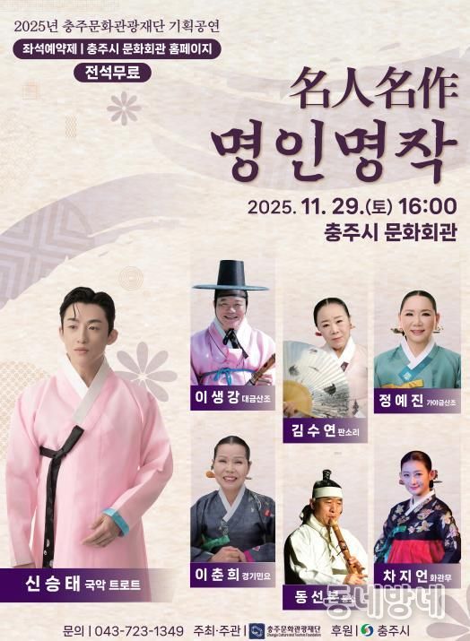동네방네 김형규 기자 | 충주문화관광재단은 오는 29일 오후 4시 충주문화회관에서 대한민국을 대표하는 국악 명인들을 중심으로한 기획국악공연‘名人名作(명인명작)’을 선보인다.