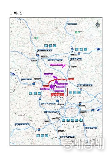 구미~군위 고속도로는 구미에서 군위군 효령면(중앙고속도로)까지 총 21.2km 구간을 4차로로 신설하는 사업으로, 사업비는 약 1조 5,627억 원 규모다. 이는 1970년 경부고속도로 이후 55년 만에 구미를 통과하여 동서를 잇는 첫 고속도로라는 점에서 의미가 크다.