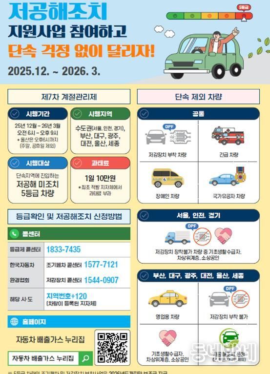 동네방네 김형규 기자 | 대구광역시는 12월 1일부터 내년 3월 말까지 4개월간 ‘제7차 미세먼지 계절관리제’ 시행에 따라 배출가스 5등급 차량에 대한 운행제한을 실시한다.