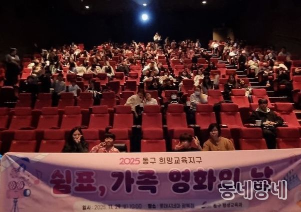 동네방네 김형규 기자 | 부산 동구는 지난 11월 29일 롯데시네마 광복점에서 2025년 동구 희망교육지구 ‘쉼표, 가족 영화의 날’ 프로그램을 개최했다. 이번 행사에는 관내 초·중학생 및 학부모 등 200여 명이 참여했다.