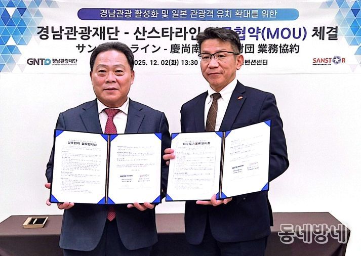 동네방네 김형규 기자 | 경남관광재단은 12월 2일 창원컨벤션센터에서 팬스타그룹 일본 현지법인인 ‘산스타라인(SANSTAR LINE)’과 ‘경남 관광 활성화 및 일본 관광객 유치 확대’를 위한 업무협약(MOU)을 체결했다고 밝혔다.