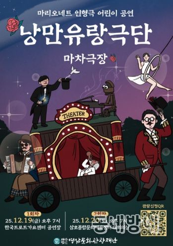 동네방네 김형규 기자 | (재)영암문화관광재단은 연말을 맞아 영암군 어린이와 가족을 위한 마리오네트 인형극 어린이 공연 '낭만유랑극단:마차극장'을 오는 12월 19일 오후 7시에 한국트로트가요센터 공연장과 12월 20일(토) 오후 7시에 삼호종합문화체육센터 대회의실에서 개최한다.