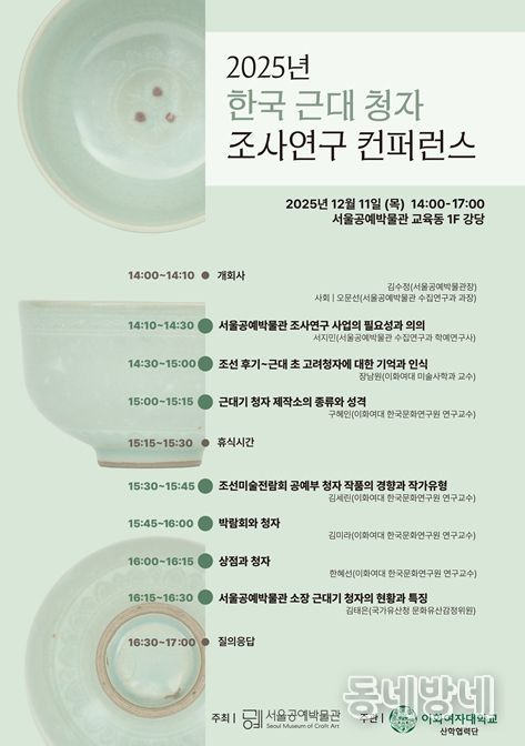 동네방네 김형규 기자 | 서울공예박물관은 2025년 12월 11일 서울공예박물관 교육동 강당에서 '2025년 한국 근대 청자 조사연구 컨퍼런스'를 개최한다. 이번 컨퍼런스는 박물관이 추진해 온 근대기 청자 조사·연구의 성과를 관련 학계 및 시민과 함께 공유하는 연구 발표회로 진행된다.