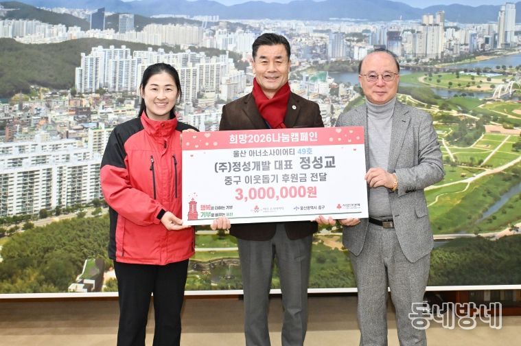 동네방네 김형규 기자 | ㈜정성개발(대표이사 정성교)이 12월 5일 오후 3시 30분 중구청 구청장실을 방문해 울산사회복지공동모금회를 통해 이웃돕기 후원금 300만 원을 전달했다.