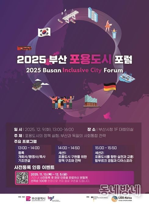 동네방네 김형규 기자 | 부산시는 오늘(9일) 오후 1시 30분 부산시청 대회의실(1층)에서 '2025 부산 포용도시 포럼(2025 Busan Inclusive City Forum)'을 개최한다고 밝혔다.